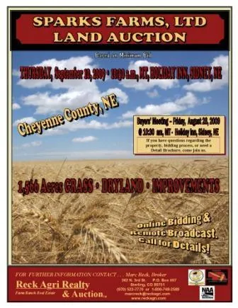1,566 acres of Dryland and Pasture to be sold at the SPARKS FARMS Ltd. LAND AUCTION on September 10, 2009. The Sparks Farms Ltd. Property is located midway between Sidney and Gurley, NE and in Cheyenne County, Nebraska. This land for sale provides an opportunity to add dryland wheatland and pasture to your current cattle, horse, livestock ranch, or farming operation.