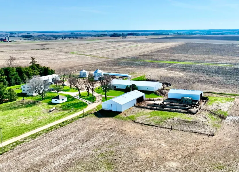 The rest of the acreage is the culmination of over 30 years of an extremely successful cattle operation. Everything from the design of the sheds to the layout of the alley ways, allows for one person to work cattle without ever entering a pen. With over 12,000 sf of this operation under roof, concrete in all the pens, self-waterers, bunk feeders, fuel tanks, on site generator, as well as a commodity shed and liquid protein tank; make this turnkey operation capable of handling 350 head of cattle. Walking through these facilities, it is obvious that they have not only been built to last but have been extremely well planned with no small detail spared. An additional 3075 machine shed also provides adequate storage for equipment, and two 6,000 bu storage bins with floor stirrers complete the operation. With all the overhead wires buried, this large farmyard is both truck and equipment friendly.