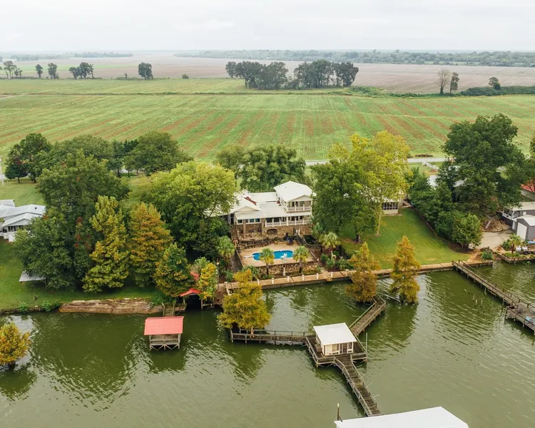 Welcome to an impressive lakefront home on Lake Chicot in Lake Village, Arkansas. Situated on a 0.41 acre lot, this property delivers the perfect blend of comfort, functionality, and recreational enjoyment. With more than 8,000 square feet under roof and 5,524 square feet of heated and cooled living space, this home was designed for full-time living and entertaining. The main residence offers four bedrooms, each with its own private bathroom, while the private guest suite located above the garage provides three additional bedrooms, also with en-suite baths, making it easy and comfortable to host family and friends. Two of the bedrooms in the main home open to a balcony, which makes for great views of the lake while drinking your morning coffee or enjoying a cold beverage in the evening. The main living area features a large custom wet bar, a brick fireplace, and plenty of room to entertain guests. The home features a formal dining area and a large kitchen outlined with plenty of cabinet space, and a laundry room and pantry are situated next to the kitchen. Facing the lake, you will find a sunroom that serves as your own personal diner, complete with commercial cooking appliances and bench seating, ideal for large gatherings.