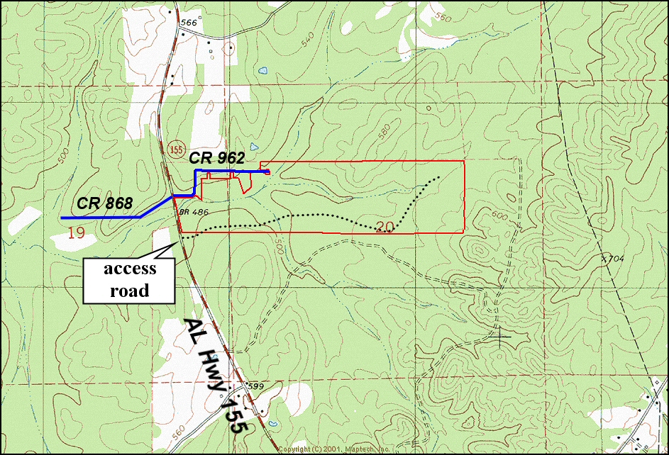 Go 2.3 miles on Al Hwy 155 to County Road 962 on the left