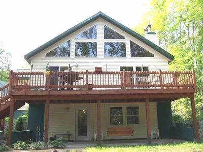 3 bedroom chalet on 4 acre private wooded parcel. Full basement with woodstove. 24' x 30' two car detached garage. Contractor built and owned. Very private. Many extras with supurb craftsmanship. Beautifully landscaped; surrounded by gardens and flowers.Approaching the entry, you cross a wooded bridge that covers a fish pond. 12' x 30' deck views woods and ponds. Very LARGE workshop