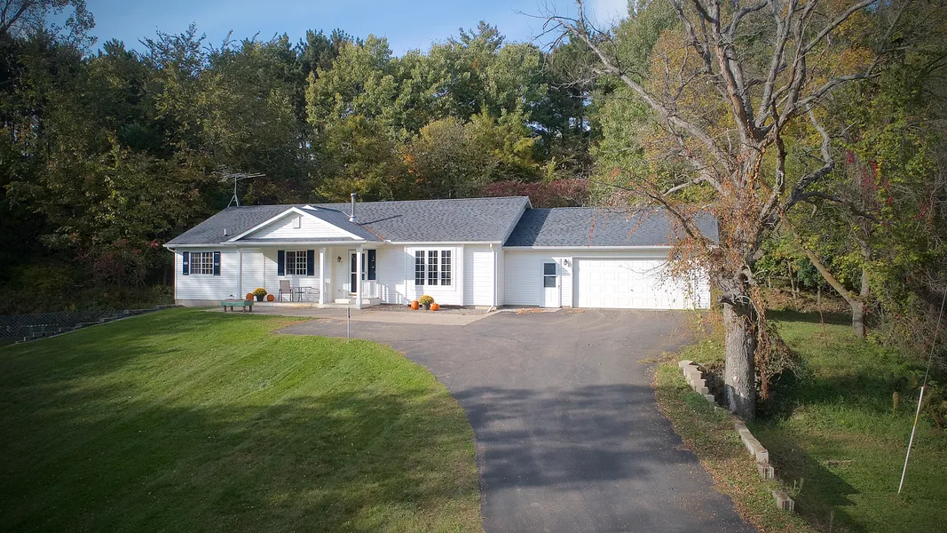 Welcome home to this beautifully wooded and secluded, 9 acre, one level living home on a private lake! Located just 45 minutes North of the metro, this home has everything you are looking for, with bedrooms, bathrooms, and laundry all on the main level and open ceilings throughout the kitchen, dining, and living room. The kitchen has extra cupboard space for storage and a large rounded island, perfect for entertaining. Enjoy watching the birds, deer, and the wildlife this property has to offer from the 4 season porch located off the dining room. The heated attached two car garage has stairs that lead to the basement, which is an awesome space to make your own! The finished 24x32 shop is perfect to working on projects all year round as it is heated and insulated with spray foam. Put a dock out and take advantage of not only the breathtaking lake views, but enjoy kayaking, canoeing, and fishing right at home. Land, lake, and location- this home is a must see!