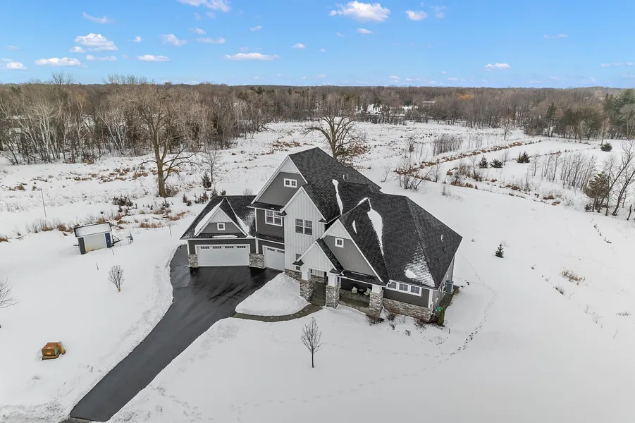 This stunning newer-construction home boasts a unique layout, high-end finishes, and offers over 5200fsf! It sits on just over 6 acres of wild wetland, where turkey, deer, pheasants, and eagles flourish. At the end of the cul-de-sac, this home offers style, sophistication, privacy, and the amenities you've been looking for all within easy distance of the cities and within a terrific school district! Be sure to check out the HD video tour to get a good sense of the house before coming to see it in person.