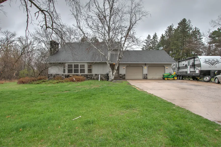 Welcome to your next home located on nearly 2 acres with prime location, expansive yard complete with huge outbuilding ready for all your outdoor toys and equipment! Upon entering this 1975 built home, you'll notice the gorgeous vaulted ceilings and unique open stairway leading into the living room. Natural light pours in through the bay windows showcasing how large this space is and the grandness of the stone front wood burning fireplace you'll want to cozy up to in colder months! Main level has 2 bedrooms and convenient powder room. The kitchen boasts stainless steel appliances and an abundance of cabinet/storage space. Even has a lookout window from the sink viewing the backyard. Quaint dining room has large built in cabinets & a sliding door that leads out to the 3-season porch. Beautiful tongue and groove detail in this space makes for a relaxing spot to read a book or watch for wildlife. Heading upstairs on the catwalk that overlooks the living room, there's a third bedroom and large primary bedroom. Primary bedroom is huge with so much closet space. Upper level holds the full bath that has a separate toilet/shower room from the vanity. Another bonus is the central vac throughout the home! In the basement is yet more finished square feet including the family room with a fireplace. Two additional den/office rooms that could potentially be upgraded to legal bedrooms by adding egress windows. Stepping outdoors, there's a trail/driveway that leads to the back of the property where you'll pass another small garage for storage and so many trees that really make you feel secluded here. A 26x40 outbuilding has electric & dirt floor, plenty of space for however you want to utilize it! Come bring your personal touches to this home and land!