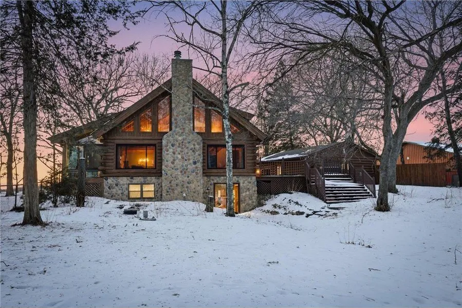 Stunning custom log home located on 12.7 acres with mature trees, this property offers privacy, space, and an exceptional setup for equestrian use or a variety of other needs. The land is thoughtfully laid out with fully fenced pastures, automatic waterers, and a total of eight stalls, along with two dedicated tack rooms, making it truly move-in ready for horses. Two large pole buildings include an 80x50 Morton shed and a 50x30 secondary building equipped with water, electricity, lighting, and a concrete floor—ideal for housing horses, tack, equipment, trailers, RVs, or recreational vehicles (30-amp RV hookup in the Morton barn). Additional storage and workspace are provided by a third garage and an extra-deep attached two-car garage featuring a wood-burning stove. The home blends original character with practical updates. The primary bathroom features a walk-in shower and soaking tub with peaceful views of the surrounding acreage. The kitchen offers painted cabinetry, solid glass doors, and a refrigerator added in 2024. Hardwood floors span the main level, with laminate flooring in the kitchen and bathroom. The lower level includes painted cement flooring and flexible space well suited for a family room, exercise area, or play space. Outdoors, the property includes maintained fencing, a designated dog area, and frequent wildlife sightings including deer and sandhill cranes—adding to the serene, country setting. Conveniently located approximately 15 minutes from Forest Lake and just 8 minutes from Chisago or Lindstrom, with easy access to Highway 35 and nearby communities such as Stillwater, Mahtomedi, Blaine, and Lino Lakes.