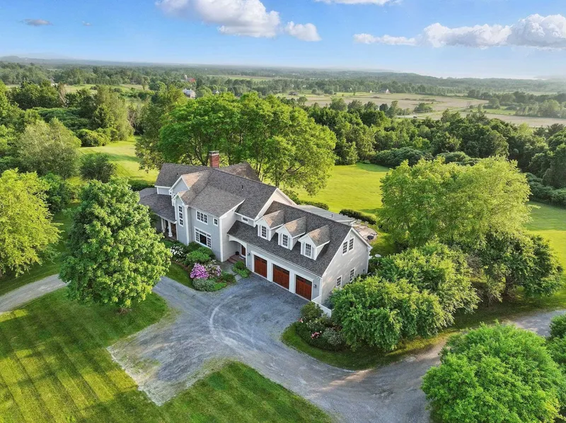 Perched gracefully on 11.79 acres, this thoughtfully designed Contemporary home in Charlotte offers breathtaking, unobstructed views of Lake Champlain and the Adirondack Mountains. Savor spectacular sunsets daily. From the moment you step inside, the open floor plan welcomes you with an airy sense of space and light, perfect for both relaxed living and elegant entertaining. At the heart of the home is an expansive gourmet kitchen, ideal for culinary creativity and lively gatherings. It flows seamlessly into a formal dining area and a dramatic two-story living room, where vaulted ceilings and large windows frame stunning natural views. The layout is both versatile and spacious, featuring two luxurious primary suites. One on the main level and another upstairs, providing options for multi-generational living or in-law accommodations. On the second floor, a bright and open landing creates a lovely flex space, while three additional bedrooms offer plenty of room for family and guests. The finished lower level expands your living space even further, with an executive office, playroom, and dedicated exercise room. An attached heated three-car garage as well as a detached heated and air-conditioned two-story barn are ideal for hobbies, storage, or creative projects. Outdoors, enjoy beautifully maintained gardens, a serene patio and pool area. A private retreat with postcard-worthy views. This is more than a home, it is a sanctuary and opportunity to live amidst VT's finest splendor.