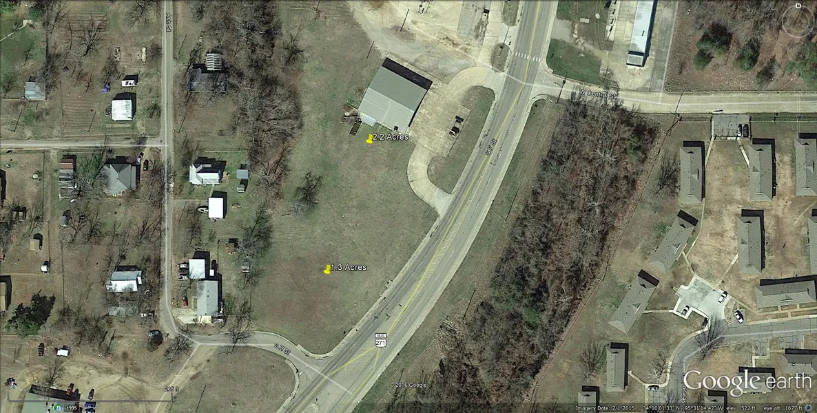 1.3 Acres located on Highway 271 South next to a large commercial building which is also for sale. Nice convenient location for a new business in Hugo. City Utilities available.