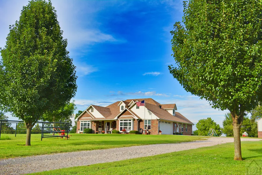 This is your opportunity to own a really special place, one that offers the benefit of rural living coupled with the comfort of having a few neighbors nearby. Drive down the long drive past a line of Bradford pear trees to the lovely, custom home on the hill that awaits. A decorative glass door with sidelights serves as entry into a foyer that focuses on one thing, the impressive space beyond it. A private study is ideally located just off the foyer, and it provides full view of the beautiful, great outdoors. On the other side of the entry is a spacious dining room, completely open and with full view of the living area, making it ideal for entertaining guests or family. A cathedral ceiling frames the living area, which offers built-ins around the fireplace, a window to the kitchen and a mixed feeling of class and comfort, which you cannot often find combined. The crisp and clean white cabinetry and appliances in the kitchen are a perfect complement to the neutral-hued counter tops. Past the main living spaces, you will find many more things to love about this home. A large master bedroom will easily accommodate a full suite of bedroom furniture. It features a beautiful tray ceiling, abundant windows, and a door leading to a covered patio. The bathroom has elegant dual vanities, a tiled shower with glass surround, and an oval, jetted tub with tile surround. Away from the other two bedrooms this home offers, this master suite is truly a private owners retreat. Should you need a fourth bedroom, game room, or play room, the upstairs flex space may be utilized however you wish. Another great feature found in this home is its interior storm shelter located within the two-car garage.
