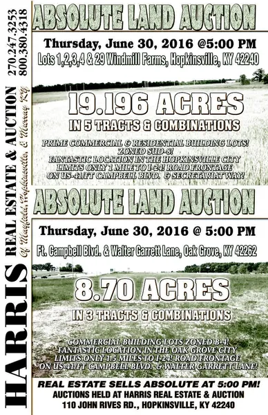 AUCTION HELD AT HARRIS REAL ESTATE & AUCTION LOCATED AT 110 JOHN RIVES RD., HOPKINSVILLE, KY 42240