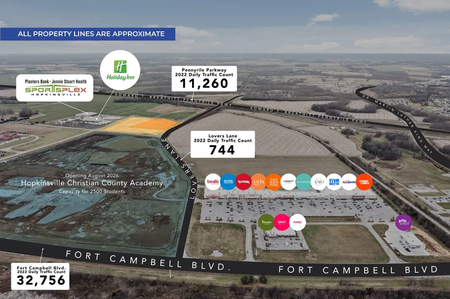Prime commercial property strategically situated adjacent to major highways to include Fort Campbell Blvd. and the Pennyrile Parkway, ensuring unparalleled accessibility and visibility. This coveted location presents a lucrative opportunity for businesses seeking optimal exposure within a thriving economic hub in Hopkinsville Ky. Located within walking distance to the Sportsplex, Holiday Inn, many shopping options and the now under construction Christian County High School don't miss the chance to elevate your enterprise in this high traffic strategically positioned space. All lots with main road frontage, preliminary plat is subject to survey.