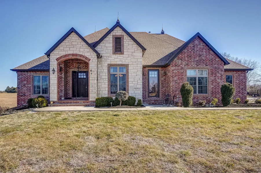 Stunning custom-built walkout basement home on over 11 acres in Ozark School District...and you can bring the horses! This quality home features over 5,700 sf, with an open floorplan, 2x6 exterior walls, mostly brick with real stone and wavy cedar accents, Andersen Low E windows, blue hickory hardwood floors, travertine tile, formal dining room, spacious living room with high ceilings and crown molding, gas fireplace, half bath for guests, stunning kitchen with granite counters, 6-burner gas stove, double wall ovens, large center island can fit 4 barstools comfortably, breakfast nook with access to the covered deck overlooking the 18x36 inground saltwater pool, lavish master suite with private access, spacious master bath with double vanities, walk-in shower, jetted tub and large walk-in closet, plus a main floor laundry room. Downstairs features 3 more bedrooms, 2 full baths, family room, and a rec room with stunning bar area perfect for entertaining, woodburning fireplace, and an amazing media room. In addition to the attached 3-car garage, there is a detached 3-car garage with overhead doors, concrete floors and electricity. Property includes Lots 13 & 14. Lot 14 allows up to 2 horses or 3 head of livestock per the CCR's. Built in 2015, this home is better than new and has been meticulously cared for, and is perfectly located close to schools and shopping!