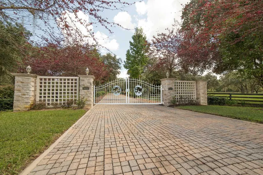 A grand gated entrance invites you into this 45 acre ranch, featuring lush green pastures with scattered Grandfather Oaks. You will be proud to call this your home driving up the 800ft tree lined alley to the main house. After an immense remodel in 2013 it now features a gorgeous custom kitchen with a huge center island, breakfast area, Quartz countertops and top of the line appliances. The great room is anchored by a travertine fireplace, while the formal living area features built-in bookcases. The classy master suite comes with a whirlpool tub, large walk-in shower and huge walk-in closet. French doors give access to the large covered terrace, screened pool & spa. The roomy guest or caretaker house has a separate gated entrance and is nestled under trees away from the main house for privacy. You'll also find a 6 stall center isle show barn, 8 stall shed row barn, 260X130 ft. arena, huge workshop and storage barn, 9 cross fenced pastures (board fencing) and 3 working wells. This place has everything you and your horse desire and is ready for immediate occupancy.
