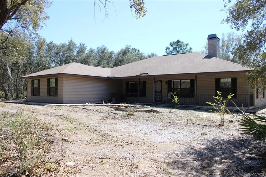 Rustic, welcoming 3/2/2 country style home maintenance free vinyl siding concrete block construction. Custom built Wheeler home on 5.94 acres directly on horse trail. Three stalls and hay storage with new fencing. Small building serves as tack room and workshop with power and water. Very private and secluded. Circular drive for easy ingress and egress. Unique two sided wood burning fireplace between LR and Master with gas starter. Tile and light oak flooring throughout. Pocket doors with large windows and skylight. Low maintenance equestrian home provides more time for riding 32 miles of Pine Ridge horse trails. Additional horseback riding in Ross Prairie.