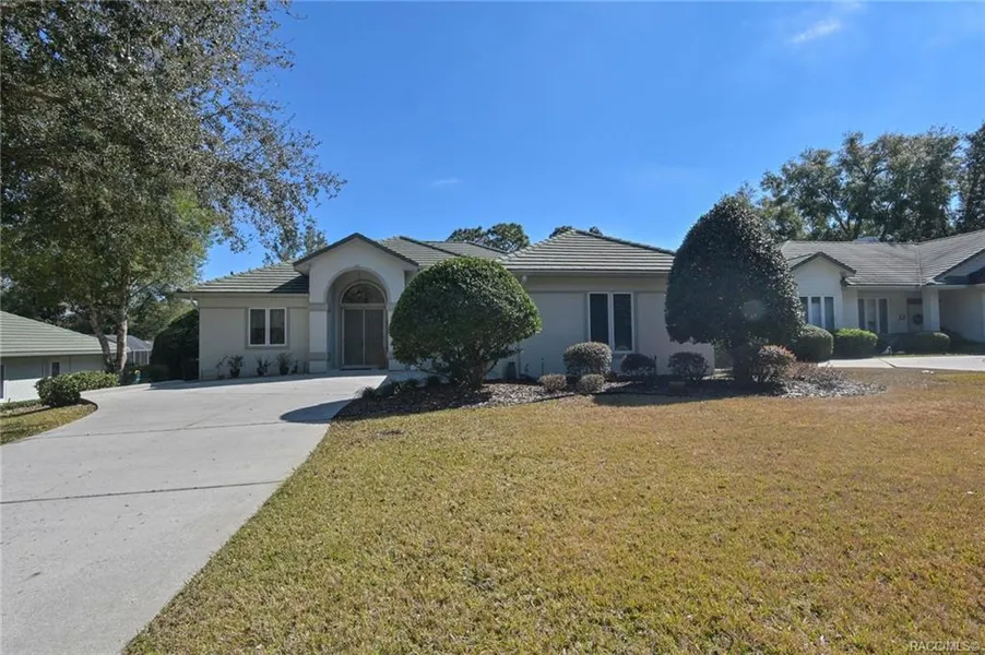 This 2244 living sq home is located in a serene setting of Wade Hampton Village, part of the gated Black Diamond community. It is highlighted by a dramatic view of the 9th fairway of the Ranch Course and a course maintained, short practice hole. The morning sun bathes the vaulted, great room with light. The large kitchen is open to the living room and dining room making this an excellent home for families or entertaining, The lanai is accessed by fully retractable pocket doors from the living room as well as a sliding door from the dining room. The master suites full bath includes dual sinks and large walk-in closet and shower. The master suite has ample space in the sitting area to function as an office area to work remotely. Opposite the great room from the master, the short hallway branches to doors for the second and third bedrooms and full bath. The 2-car garage has a golf cart entrance. A new roof as well as exterior and extensive interior painting were completed in 2019. Interior features: Open floor plan, vaulted ceilings, master suite with dual sinks, garden tub, walk-in shower, walk-in closet, second and third bedrooms opposite the master, solid surface counters, pantry, bookcases, smart thermostat for remote access.