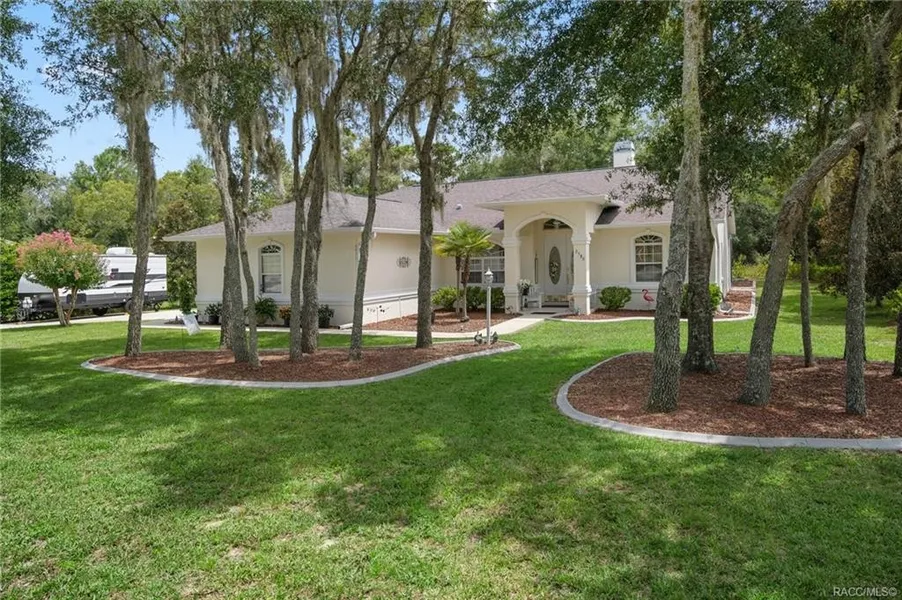 Looking for a meticulously maintained, high and dry home with NO deed restrictions. Look no further! Nestled on a beautifully wooded 1/2-acre lot this home has 1,772 sq ft of well laid out living space featuring 3 bedrooms, 2 baths, formal dining, kitchen with breakfast nook and great room with wood burning fireplace. Neutral tones and natural light welcome you as the enter the home through the double entry doors, vaulted ceilings throughout, ceramic tile in main living and laminate wood flooring in bedrooms. Kitchen offers crisp clean white cabinets, under cabinet lighting, stainless steel appliances, granite tops, pantry and ample cabinet space. Owner's suite features his and her closets, dual sinks, walk in shower and soaking tub with access to rear lanai. 8ft French doors open up to your backyard oasis with Panoramic screens allowing you to enjoy your backyard paradise without an obstructed view! Heated Inground saltwater fiberglass pool built in 2018 with spacious lanai is the perfect place to relax and unwind. Exceptional storage throughout this home, including a 24x24 detached garage with epoxy flooring. Landscaping is pristine with curbing throughout, expanded drive for plenty of parking for your boat or RV and public water. Centrally located within minutes to shopping, restaurants and schools. Pride ownership truly shines throughout this home, call today to schedule a tour!