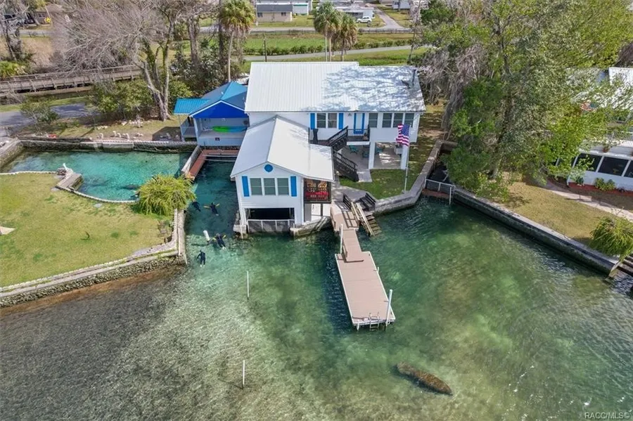 EXPANSIVE WATERFRONT VIEWS DIRECTLY ON HUNTERS SPRINGS! Blue clear spring fed water and a favorite gathering spot for manatees! Masterfully gutted interior and reconfigured into perfect waterfront home. Detached 4th bedroom suite with bath. Renovate in 2016, virtually everything new; Metal roof, new seawall, added 500 sq ft living area. Gorgeous kitchen with wood cabinets and granite, Totally remodeled baths. Boat house, boat slips and dock. MUST SEE TO BELIEVE.. Price at appraised value on 11-7-2023 at $1,238,000