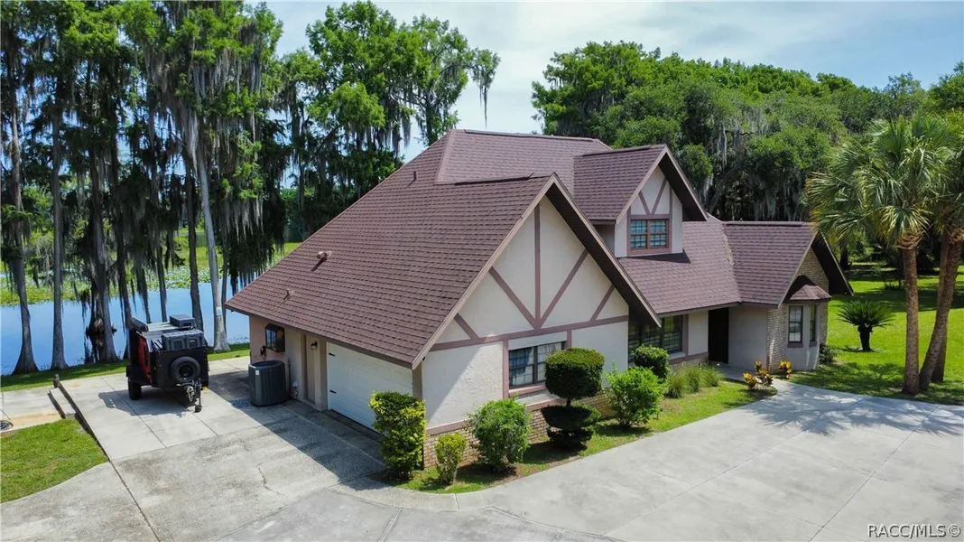 WIDE OPEN LAKEFRONT on Big Lake Henderson. This impeccable deal will be sure to have you asking "where do I sign?!" Expansive open water views from almost every angle of the property. Deep water right off your shoreline. This Tudor style home is meticulously maintained, easily checking all the boxes on your list of wants and needs. This home offers many thoughtful updates throughout including, ceiling fans and light fixtures, custom fit blinds in all the windows, a water filter system, and recently a new garage door was installed this year. The roof, A/C, solar fans in attic, and sliding glass doors were all updated in 2014. Also a large concrete circle driveway and additional parking area just beside the garage was added in 2014. This gives you plenty of room for parking your all of your toys. The exterior grounds shows off a multitude of mature native Florida palm trees, sago palms, water oaks, and cypress trees along the shoreline. Decorative shrubbery is tastefully placed around the exterior of the home. Take a step inside and you are sure to fall in love with the idea of life on the lake. The Main living area is split between a ground floor boasting a Kitchen with large bay windows, a breakfast nook and bar, expansive living area with LVP flooring and a wood burning stone fireplace. The guest quarters are downstairs as well complete with two bedrooms and an updated bathroom. Make your way up to the second floor to the extra large Master Suite complete with a walk in closet with custom built in shelving, a full bathroom with a generously sized vanity plus powder station. From the master suite, walk out the sliding glass doors onto the over sized balcony offering breathtaking views of the open lake. Head out back to the screened in 12' x 20' porch area, and a 12' x 24' concrete patio. All of this is over looking the one of the best views on all of Lake Henderson. This is your opportunity to own a truly one of a kind property in one of the most sought after locations on all of the Tsala Apopka chain of lakes.