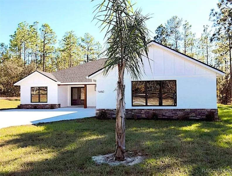 Escape the ordinary in this brand new 2025 custom-built home located in the prestigious Pine Ridge Estates. While other homes offer a standard layout, this ranch-style residence was designed for an elevated lifestyle. Nestled on a sprawling one-acre lot, the property features an extended concrete driveway leading to a three-car side-entry garage. This garage includes two bays for vehicles and a versatile third bay with a side entrance, perfect for housing your recreational toys or lawn equipment. Approaching the home you will encounter a brick paver covered front porch, an ideal spot for relaxing. Step inside and be greeted by a massive, open-concept floor plan that seamlessly blends all primary living spaces. The interior is enhanced with laminate wood flooring, abundant recessed lighting, and designer fans. Sliding doors open to a spacious brick paver covered lanai, perfect for entertaining or enjoying quiet evenings outdoors. The gourmet kitchen is a chef's dream, boasting gleaming granite countertops, pristine white shaker cabinets, stainless steel appliances, and a walk-in butler's pantry for all your storage and meal prep needs. Retreat to the luxurious owner's suite, which offers a spacious walk-in closet and a spa-like ensuite with dual sinks set in granite countertops and a stunning glass-enclosed, tiled shower. Two additional generously sized bedrooms, one with a walk-in closet and the other highlights tranquil backyard views, providing comfort and privacy. This quality-built home offers the perfect blend of comfort and style, inviting you to enjoy the best of Pine Ridge and the Florida lifestyle. Builder's 2-10 Warranty included.