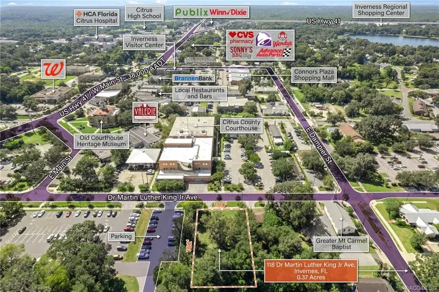 Prime development lot located in the city limits of Historic Downtown Inverness! This .37 acre parcel is located in the Central Business District, offering zero lot lines with a maximum of 80% impervious lot coverage and a maximum building height of 70’ from grade, allowing for up to 3 stories of building improvements. This parcel has an excellent location adjoining the Citrus County Sheriff’s Office and across the street from the Citrus County CourtHouse, Citrus County Tax Collector and Property Appraisers, with access to offsite city parking, Wallace Brooks and Liberty Parks boarding Lake Henderson (The Depot District) and the Withlacoochee State Trail, a 46-mile long paved, multi-use, non-motorized rail trail in Florida located in Citrus, Hernando and Pasco counties which attracts cyclist and tourist worldwide. Within walking distance from CourtHouse Square and a multitude of local boutiques, restaurants and businesses. Permitted uses in the CBD district include professional office, retail, restaurants and so much more. The City of Inverness is a vastly growing municipality favorable for development and growth with 70,000 local visitors in peak season and located in Citrus County part of the Tampa-St Petersburg MSA, the 18th Largest in the nation. With a population of 155,582 residences and growing annually at a rate of 1.29%, Citrus is the 34th largest county in the State of Florida. Citrus County is large and land barren, with over 60,000 vacant parcels green-lighted for development, plans to expand utilities across the county, and further improving and widening of several cross connecting highways, including the newly completed extension of the 589-Toll Road to SR-44 with further expansion to CR-486 (FY 2023).