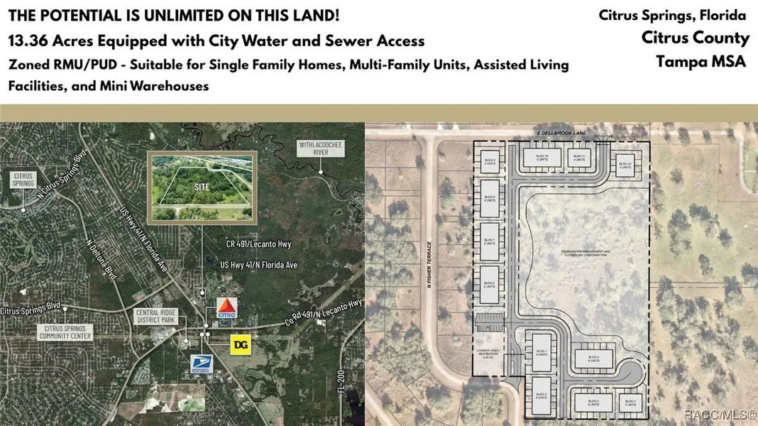 Fulfill market demand with this prime Planned Development Residential offering 13.36 acres in Citrus Springs Florida located in Citrus County. This versatile zoning in the Planned Residential Area is tagged for Future Development under the future Land Use of RMU residential mixed use development. This zoning classification gives you an opportunity to file for PUD application and Master Plan for development to entitle the property to allow single family free standing, single family attached, Duplex and Apartments and other uses include, recreational and some limited commercial/industrial use (with approval of Nursing Homes, Assisted Living Facilities, Veterinarian office/hospitals, grocery store, mini warehouse and boat/RV storage) subject to a PUD application submittal and approval. Located in the Citrus County Water and Sewer Territory but is currently not attached to public utility and depending on your master plan for development may be a requirement to be brought to the site to be able to do larger density residential development. Located in the Central Ridge the subject property is conveniently located within less than a quarter mile from US Hwy 41/Florida Avenue a federal two-lane connecting the parcel to Dunnellon and beyond to the North and Holder, Hernando, and Inverness to the South all the way to Miami. Disclaimer: All information provided herein is for marketing purposes only and is not guaranteed for accuracy. Prospective buyers or tenants are encouraged to conduct their own independent due diligence. The seller, broker, and associated parties make no representations or warranties, expressed or implied, as to the accuracy or completeness of this information. All dimensions, zoning details, financial data, and other property-related facts should be independently verified. Please consult with appropriate licensed professionals before making any investment or purchasing decisions.
