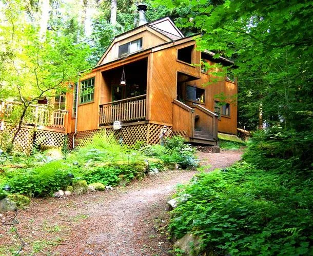 This cabin is in a private setting in the MT. Hood foot hills, all wood inside and out, bamboo flooring, french doors leading out to a huge deck, lots of windows let in light, woodstove, and propane heat. This artist's cabin is walking distance to Clear Creek, 5 minutes to the Resort At the Mountain Golf Course, 20 minutes to Mt. Hood Ski Bowl, 5 minutes to hiking trails, and 20 minutes to Trillium Lake. Log on to my website I'm very easy to find and take the virtual tours.-Jewel Stockli