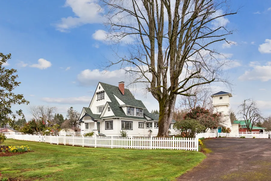 Welcome to Beavercreek Lavender Farms, located just minutes from Oregon City, Beavercreek and Portland. A gated entrance greets you with thoughtfully curated landscaping surrounding this custom renovated historical home and water tower guest quarters. The 846 square foot renovated water tower is perfect for even your most discerning guests. A cheery dutch farm door greets you and features a well appointed guest suite, lush bathroom, custom gourmet kitchenette with artful touches of old growth timber, as a nod to the farm’s rich Oregon history. Guests will enjoy outdoor fireside chats around the wood burning fire pit in the sprawling yard in the evenings before retiring for the night, to comfortably enjoy their night in the country. The main house features the primary suite on the main floor with a gas fireplace, attached sunroom which leads to the paved outdoor living space and hot tub. The primary bathroom features a free standing tub and custom steam shower, walk in closet, private reading or office space and laundry room. The gourmet kitchen, formal dining room and family room are perfectly situated for multiple groups to gather and enjoy themselves with large windows overlooking the property, old growth cedar ceiling beams, two gas fireplaces with old growth timber custom mantles and custom curated tile detailing. The kitchen has a walk in pantry with an additional refrigerator alongside the arched beverage nook with an under counter fridge and artisan custom tile, giving this modern farmhouse a relaxed yet polished feel. The grounds are what make this property truly a delight with gravel walkways to the 5 outbuildings that include a shop, artist studio, the ultimate in entertaining party barn with a jukebox, vintage bar, library study and sleep loft. The nearly year round blooming master gardener planned landscaping with over 3200 established planted bulbs will bring an explosion of color and a new appreciation for the Pacific Northwest. Outdoor riding arena, fruit trees, chicken coop and 6 stall horse barn with cross fenced turnout pastures that overlook the adjacent property pond. Beavercreek Lavender farms is in farm deferral, due to the annual harvesting of the 600 established lavender plants, with an additional 150 plants that were planted in the fall of 2022 for future harvesting. A truly remarkable 9.49 acre farm with endless possibilities that you can truly call home.