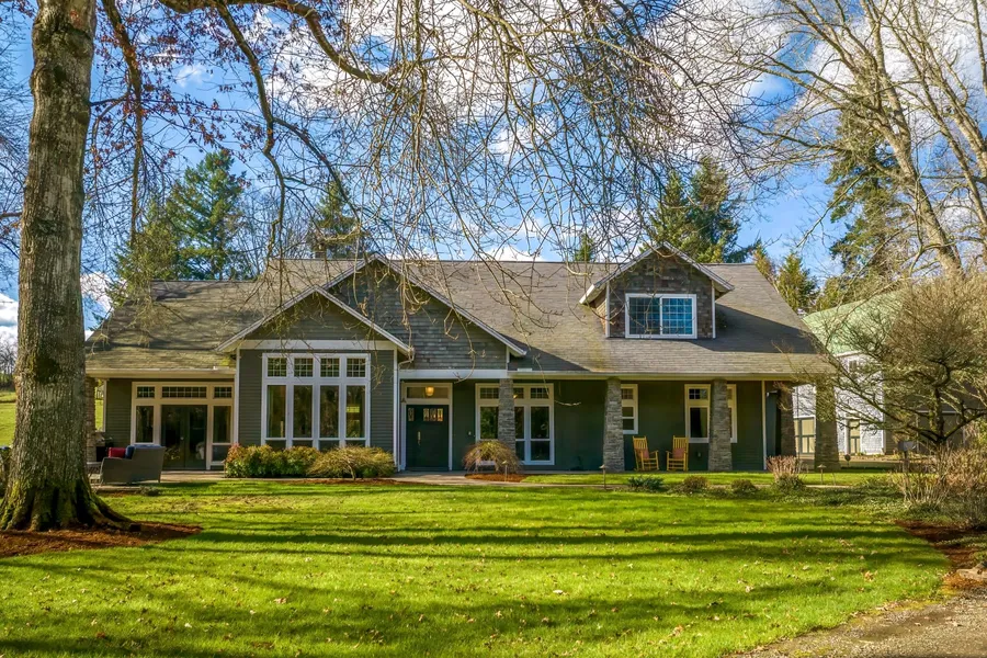 Nestled on a lush lot surrounded by picturesque farm country, this gorgeous contemporary home boasts the best of both indoor and outdoor living. Bespoke Craftsman details, shingle siding and stacked stone columns on the exterior, rich hardwood floors and custom hand-hewn wooden beams inside complement the property's idyllic setting. The living area is bright and airy with vaulted ceilings, expansive windows and access to a side patio with multiple gathering areas. The adjacent sitting room, highlighted by a floor-to-ceiling rustic stone fireplace, offers the ideal setting for post-dinner fireside conversation. The kitchen features granite countertops with chiseled edges, a Viking cooktop, a farmhouse sink and a pantry. A sun-drenched breakfast nook overlooks the backyard and connects to the rear covered patio creating a seamless transition for indoor/outdoor dining. Tucked away on the main level, the luxurious primary suite boasts a fireplace, soaking tub, tiled shower with dual heads, dual vanities and a generous walk-in closet. Additional main floor spaces include a laundry room, a full guest bathroom, a home office and an art studio that doubles as additional office space. The 2nd floor hosts 2 bedrooms and a full bathroom along with a bonus room featuring vaulted ceilings, a built-in wet bar and an adjacent unfinished storage area that allows for a 4th bedroom conversion. At nearly an acre, the property is meticulously landscaped and includes a lovely garden area surrounded by hedges and a rolling lawn with a water feature. A standalone 3-story building houses an extra-deep garage on the ground floor, a workshop with a full bath on the second floor and a 3rd floor guest space. Its shingle siding, gambrel roof and artful exterior carvings mirror the Craftsman elegance of the main home. Conveniently located off I-5 along the Willamette River, Wilsonville combines a charming small-town ambiance with proximity to Portland, just over 20 minutes away.