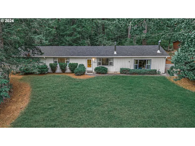 Lovely custom-built, one owner and 1-level mid-century ranch home on 3.7 beautiful acres! This spacious home sits back from the road in a private and natural wooded setting. Breath-taking scenic views are featured from the picture windows of the living room, while enjoying the cozy woodstove, too! The oversize family room features a 2nd woodstove and a large dining area, too. The handy kitchen has newer appliances, an eating area, and a sliding door to a large covered patio, perfect for entertaining and BBQ's! 3 oversize bedrooms, many storage closets, and a large laundry room with deep sink and a washer and dryer. The property includes a large workshop/barn with 2 parking areas, and a woodshed and carport parking, too. Newer roof, gutters, A/C, water heater and more! A must-see stunning property with the scenic Clackamas River being right across the street!