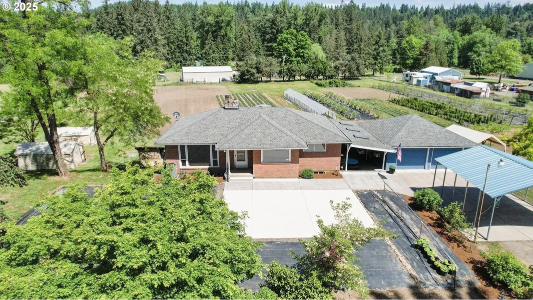 Welcome to this 3 bd, 2 bath midcentury modern home featuring beautiful built-ins, fireplaces, hardwood flooring, and exterior brick. Enjoy the living room's massive picture window allowing abundant natural light. Possible separate living quarters in unfinished day-light basement. Step out the kitchen door to 25 rows of strawberries, 11 rows of raspberries, 10 rows of blueberries, and 15 fruit trees. This 3 and 1/3 acre hobby farm offers a connection to the land with ample space for a diverse garden. Two wells more than handle the irrigation load. Incredible opportunity to own/work a small rural farm--but still only ten minutes from the city.