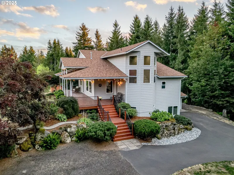 No Sign on Property, please do not drive down gravel road without an appointment. Breathtaking Mt. Hood views! This exquisite 3-story home is filled with natural light from abundant windows, offering a spacious, open floor plan perfect for gatherings. The private primary suite features an open concept with a beautiful Mt Hood view, a large bathroom with walk-in shower, double sinks, soak tub, and walk-in closet. Flexible office space could serve as a 4th bedroom. The roomy kitchen with island and hickory cabinets is ideal for everyday living. Enjoy manicured grounds with fruit trees, garden beds, and spacious deck, lower patio, fire pit, and a small tank pool. The lower level offers potential for dual living. A true retreat with comfort and beauty in every detail. The home and property are meticulously cared for and move in ready!