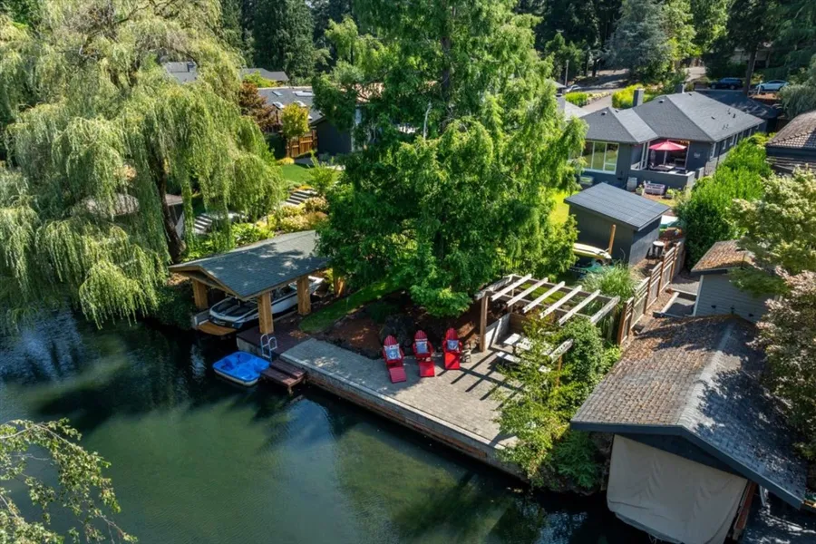 Welcome to this beautifully maintained ONE-LEVEL ranch style WATERFRONT home exuding charm and character. Located on the FUN main canal, you don't need to lower your boat tower as you cruise under the bridge to the main lake! This one-of-a-kind property combines old-school allure with modern comforts, nestled on a desirable walkable street. The rare large FLAT fenced yard walks directly to the waterfront. A wide and usable BOAT HOUSE with BOAT LIFT makes lake living a dream, while the spacious lakefront patio offers serene lake views. Inside, you'll find space for everyone, including a versatile bonus room that can be adapted to suit your needs, whether it's a home office, gym, 4th bedroom or additional living area. Large floor-to-ceiling picture windows flood the home with natural light and provide picturesque views of the landscape and lake. The usable finished attic provides extra storage or potential for creative use. The work shed off the garage is ideal for DIY projects or additional storage, and the adorable she-shed offers a delightful space for play, work, or unwinding, adding a touch of whimsy to your backyard. A private front courtyard offers a secluded entrance that adds an extra layer of privacy and charm. ADDED BONUS-Irrigation systems pull water from the lake for watering! Experience the best of Lake Oswego living with this unique and enchanting lakefront property. Schedule your private tour today and discover the timeless appeal of this lakeside gem!