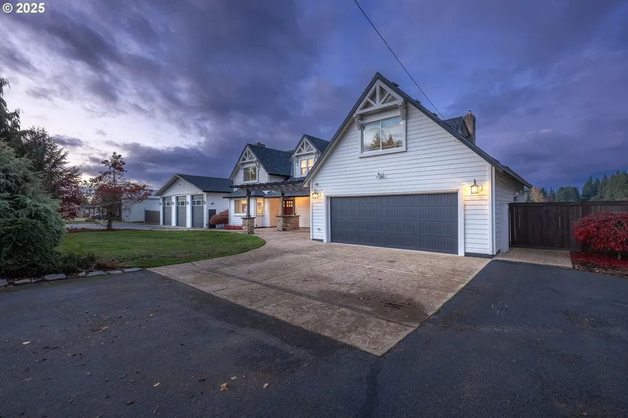 Virtual Staged Halloween photo***Welcome to this beautifully remodeled custom home on 1.45 acres in the heart of Boring. Offering over 3,200 sq ft of living space, this 4-bedroom, 3-bath residence combines comfort, function, and timeless style. The main level features an open concept with spacious living and family rooms, a cozy pellet and wood-burning fireplace, and a gourmet kitchen with granite countertops, large island, and professional-grade stainless appliances. The private primary suite boasts a balcony, walk-in closet, and a spa-like bath with jetted tub. Additional bedrooms are generously sized, and the bonus areas provide flexibility for work, play, or hobbies. Step outside to enjoy a level, fully fenced property with a covered patio and gazebo-perfect for entertaining or relaxing while taking in the scenic farmland views. The 40x50 heated workshop with 220V power and full bath...