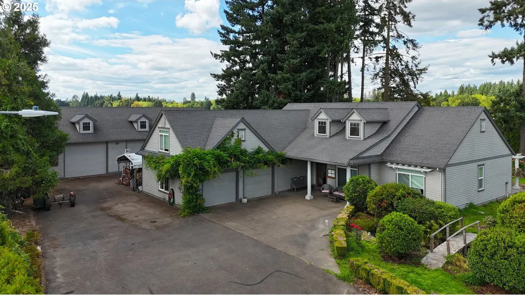 Lovely custom home at the end of a long paved driveway lined with fruit trees, surrounded by picturesque farmland in a great commute location. This 2,714 sq. ft. home offers 3 bedrooms and 2.1 baths on 1.02 acres, with the majority of the living space-including all bedrooms and the primary suite-on the main level. The huge open floor plan features high ceilings throughout, a kitchen with granite counters and stainless appliances, a family room with slider to the covered back patio, and upstairs a spacious bonus room with a wet bar-perfect for entertaining or relaxing. Enjoy two electric fireplaces, RV parking, an irrigated yard, and outdoor features that make this property truly special-playhouse, chicken coop, and a beautiful pond with a charming bridge. Large 44' x 27' shop (1,188 SF) includes 432 SF finished area with full bath, common bedroom, and kitchen eating area-ideal for hobbies or workspace; however, per county records, these spaces are not approved for residential use. Inside, the laundry room boasts a large sauna for your relaxation and wellness. With a 2-car garage, ample parking, and a peaceful rural setting just minutes from town, this is a must-see property that blends comfort, functionality, and charm.
