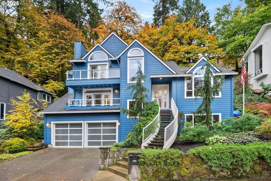 Radiating curb appeal and tucked among tree-lined streets, this Lake Oswego retreat blends striking architecture with everyday comfort in one of the city's most desirable neighborhoods. Vaulted ceilings, expansive windows and rich hardwood floors create light-filled interiors that feel open and inviting. The main level flows effortlessly between living, dining and family rooms; spaces designed for connection, entertaining and quiet moments. The kitchen impresses with slab granite counters, floating shelves accented with layered lighting, a built-in pantry and stainless-steel appliances, all wrapped in a cool, moody palette that feels refined yet relaxed. Just off the kitchen, a dining nook opens through sliding doors to an expansive deck framed by lush trees, perfect for morning coffee or evening gatherings. The spacious family room features a statement fireplace, custom built-ins and a private balcony. Upstairs, a light-filled stairway with a skylight and built-in bookshelves leads to a dramatic primary suite with vaulted ceilings, dual sliding barn doors, sleek tile flooring and serene tree views from a private balcony. The spa-inspired ensuite includes vessel sinks, a soaking tub and a tiled walk-in shower. Two additional bedrooms and a stylish hall bath complete the upper level. Downstairs, a versatile flex space is ideal for a gym, studio or home office. Outdoor living continues with an expansive composite deck surrounded by nature and sleek glass railings that modernize every balcony. An oversized two-car garage offers new doors, openers and ample space, even enough for a golf simulator! Added highlights include air conditioning, generator wiring, central vac and a Sonos outdoor sound system. Conveniently located to Hwy 43, with a path to George Rogers Park and moments from downtown Lake Oswego's shops, restaurants and hot spots, this home embodies life's best balance; city energy when you want it, a peaceful retreat when you need it!