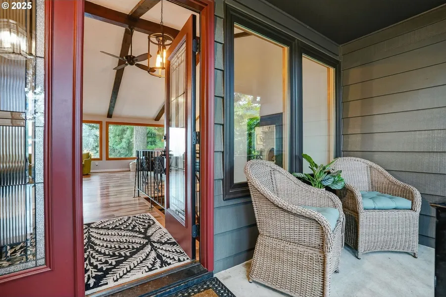 Secluded 2-acre wooded estate with breathtaking Mt. Hood views your private sanctuary awaits! This remodeled Mid-Century home blends timeless character with thoughtful, high-end updates. Step through the formal foyer into a light-filled living space with vaulted timber-beam ceilings, a wall of new Renewal by Andersen windows, and a cozy gas fireplace framed in white limestone. The open dining area flows effortlessly to the brand-new composite deck with metal railing perfect for morning coffee, summer BBQs, or a future hot tub overlooking the manicured yard and illuminated pergola. The chef's kitchen features sleek Quartz counters, KitchenAid convection oven + microwave, Jenn-Air downdraft cooktop, refurbished indoor Majestic Char-Grill gas BBQ, and oversized pantry. The main floor hosts a spacious primary suite with remodeled bath and walk-in closet, plus an additional bedroom and update...