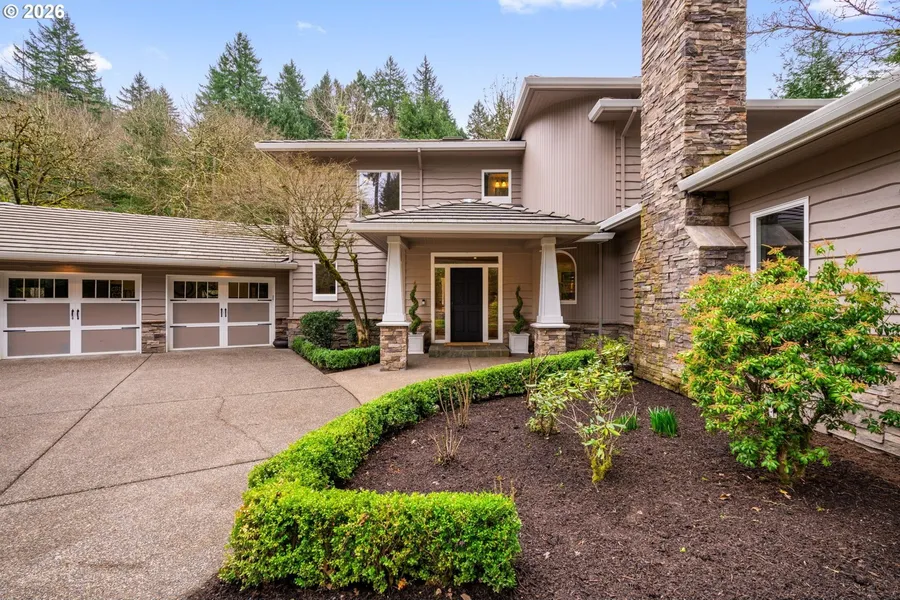 There's a moment, pulling into the private driveway, when the trees close in and the noise of the day simply stops. That feeling-where your shoulders drop and your breathing slows-is what it's like to come home to 18977 Barton Road. Set on nearly a full acre of wooded, fully fenced privacy in Lake Oswego's Westridge neighborhood, this custom cedar-and-stone residence delivers over 5,000 sq ft across three thoughtfully designed levels-extensively remodeled with hundreds of thousands invested in upgrades. The main level is where daily life and entertaining come together. A gourmet kitchen with Sub-Zero, Viking range, double oven, quartz island, and beverage fridge opens to the family room with hardwood floors and fireplace. A formal dining room offers generous space for gatherings. A sitting room with its own fireplace provides a quieter retreat, while a remodeled laundry room, mudroom, pantry, and half bath round out a main floor that has everything where you need it. Upstairs, the primary suite is the centerpiece-with an award-winning bath designed by Metke Design, featuring a beautiful oversized soaking tub and spa-caliber finishes. Two additional bedrooms and a freshly remodeled full bath complete the upper level. Downstairs, two more bedrooms, a full bath, and a large bonus room with fireplace and patio access create ideal space for entertaining, media, or guests. Outside: a sport court, oversized four-car garage plus lower-level garage, dedicated RV parking, and room to spare. A fully fenced yard with gazebo, outbuilding, and workshop-surrounded by mature trees, creek views, and the kind of quiet that makes you forget you're minutes from town. A whole-house generator keeps everything running when the weather has other plans. Award-winning Westridge Elementary and Lakeridge High are minutes away. Downtown Lake Oswego-a short drive. Portland-15 minutes north.