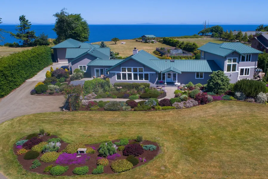 At first glance you will be wowed by the beautifully maintained gardens and grounds. Then you will be captivated by the stunning views from nearly everywhere! This warm and welcoming custom home is perfectly sited on high bank waterfront to capture panoramic water views to the North and picture-perfect views of the Olympic Mountains to the South. With views from every room, you can look directly across the Strait of Juan de Fuca, Canada, and the San Juan Islands, or the ever-changing sunrises over the mountains. Nature's Bounty awaits! Set on 4.57 level sunny acres, this meticulously planned Garden of Eden includes stunning flowers and shrubs, mature fruit trees, and a garden full of fruits and vegetables. Designed to bring the outdoors in, the open and easy flowing floor plan is warm, inviting, and smartly incorporates formal and informal living spaces. Tall, vaulted ceilings, exposed b...