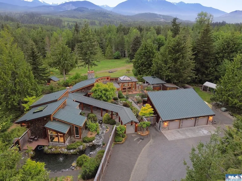 Architectural masterpiece! Nearly 40 private acres with commanding mountain views, custom finishes & sustainable luxury nestled in the pristine Pacific Northwest beauty, this extraordinary estate is a true work of architectural art designed with intention, craftsmanship, and reverence for the land. Every element has been curated with extraordinary vision. Step inside and feel the warmth of radiant floors beneath your feet, natural light filtering through floor-length windows, and hand-finished woodwork shaped from a single Douglas fir tree. Bamboo ceilings, custom beams, and organic textures echo the surrounding forest, while subtle modern comforts like whole-home audio, a chef s kitchen, and seamless indoor-outdoor flow support an effortless lifestyle. One-of-a-kind sanctuary, seamlessly blending luxury with sustainability and timeless design. Wake with the sun in the vaulted primary suite, meditate in the glass-wrapped sunroom beneath a luminous skylight, or host unforgettable evenings in the outdoor kitchen beneath the stars. Expansive courtyard gardens bloom around the waterfall, koi ponds and abundant curated plantings, while mature timber and private water supply promise long-term value and sustainability. This is a home for those who seek beauty in the details, intention in the design, and complete privacy without compromise. Legacy-quality, turn-key ready, and truly without equal.