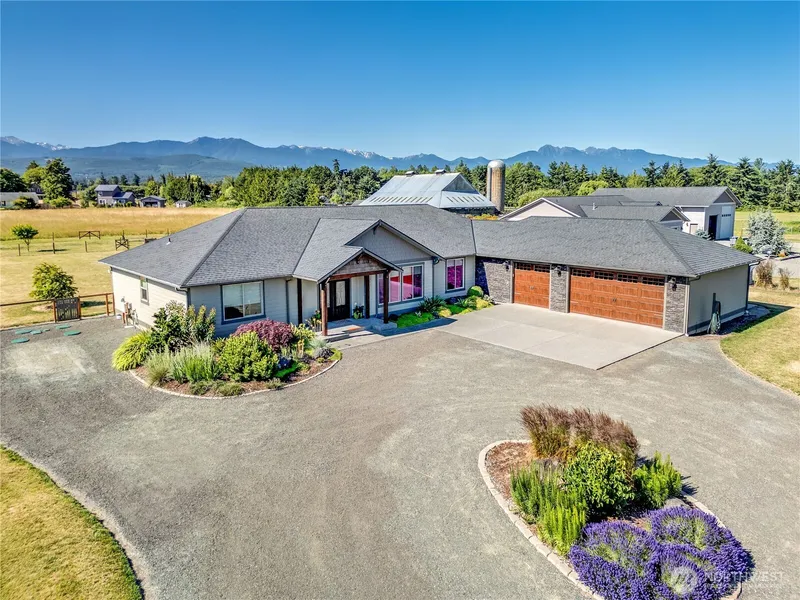 Presenting a gracious, immaculate one-level home with stunning Olympic Mountain views. This beautifully crafted residence features an open floor plan w/ vaulted ceiling, quartz counters, SS appliances, soft-close cabinetry, propane fireplace & heat pump for heating & cooling. South-facing triple-pane windows fill the space with natural light. Sliding doors open to the covered patios to enjoy the outdoors. Set on over one level acre of land with raised garden beds, fruit trees, RV hookup with dump station, powered outbuilding, wired for hot tub, & plumbed for BBQ, get ready for a great summer. The circular driveway & 3-car garage complete this exceptional property. Lovingly cared for the details throughout add refined elegance. A true gem.
