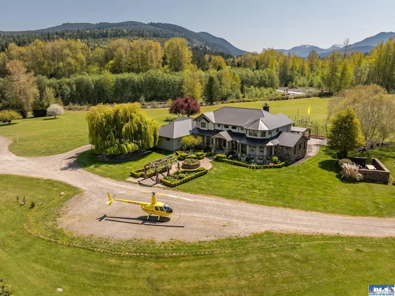 This empire era manor house on 18.75 acres and a quarter mile of river frontage combines the solid materials and fine craftsmanship of the old world with the amenities and conveniences demanded of today s lifestyle. The foundation, wood cladding, and heavy stone-facing appear to rise out of the earth, firmly planting the home in the center of the sprawling farm stead along the edge of the historic Dungeness River. The interiors are remarkable at every level: from the blown glass light fixtures to the thousands of board feet of custom Honduran mahogany paneling and trim, to the antique chestnut flooring, to the custom steel work and timber crafted antique oak frames this marvelous home shows both elegant grandeur and a comfortable coziness rare in any era. Controlled access to the property and main house is through a stone and custom steel gate, key and remote controlled. You enter and drive along a meandering, ornamental cherry tree-lined driveway. As you approach the home on the right there are extensive fenced berry fields and fruit trees. At the end of the driveway you see the multi-purpose agricultural building that includes a commercial processing kitchen (or to support large events) with cold and dry storage, a high-bay for a small 4-seater helicopter, 40 foot diesel pusher, and/or agricultural drying, several heated workshop/storage spaces, and ten farm equipment bays. The 18.75 acre farm has NOP/WSDA certified organic crop producer status. Beyond the Ag building runs the quarter mile frontage of the dike protected Dungeness River. The main house is oriented with its long axis running east-west allowing all interior spaces to be washed with abundant daylight, following the day s activities from sunrise to sunset. The walkway to the entry porch is crafted using Japanese sashimono joinery, the arched trellis assembled without any metal fasteners at the hinge-points. The walkway is flag-stone paved enveloping a center sculptural element midway. To the east end of the home is the garage and guest apartment, to the west is the south facing primary suite. The center of the home is where the expansive kitchen and dining nook is located, the main dining room, the formal staircase to the upper level and a timber crafted beamed living room ceiling with a majestic stone and copper clad modified Rumford fireplace, warmly embracing the entire primary living spaces. All, including the entry area, are overlooked by the open bridge that joins the two halves of the upper level: to the east are two refined bedrooms with private vanities and built-ins and a shared shower/toilet room; to the west the large media room with state-of-the-art sound system, 110 projection screen, under counter refrigerator and bar sink. Opposite the media room is the large home office with built-in desks. The primary living spaces and Kitchen open on to an outdoor enclosed dining room, trellis covered patio, a freestanding pergola, both framed in massive redwood timbers (the pergola includes custom outdoor dining furniture, a custom rolling chopping block/pizza prep table, and projection screen for outdoor movies), and a massive, stone faced wood fired oven suitable for pizzas and other cooking including a stainless steel prep table. The setup includes all the custom-made oven tools on a rolling stand. This area has a massive outdoor firepit with footrests and a cooking swing arm set into the stone work patio. Stone and wood benches at the perimeter bracket the area, all which is highlighted by a beautiful stone moving-water feature. Espaliered fruit trees bracket the outdoor living spaces which overlook the farm fields and hot houses. On the exterior heavy stone veneer at the entry and surrounding wainscot are combined with 28 number one sawn cedar shingles and cedar trim, pre-finished with two finish topcoats after installation to wrap the home in solid cladding. Attached garage for 2 cars, detached can accommodate a helicopter or RV and 9 more cars.