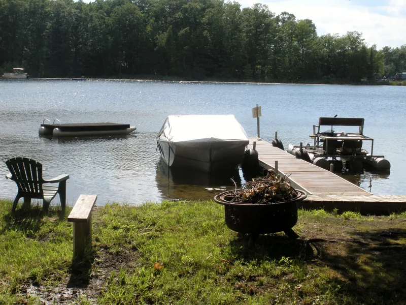 Just a great spot on all sports Perch Lake in Clare county. With 60' of private frontage on this central Michigan lake located in a quiet area, with a sandy swimming beach. There is well, septic and electricity on sight, along with a 2000 Skyline 30' trailer with well/septic. Trailer has a lovely screen room for catching the breeze. There is a separate cabin with a bedroom. Offered just as you see, 'turn-key' includes 48' aluminum dock, 1980's speedboat with 75 HP motor, paddleboat, canoe and fully furnished. A fully equipped playground - just pack a suitcase and grab a fishing pole!