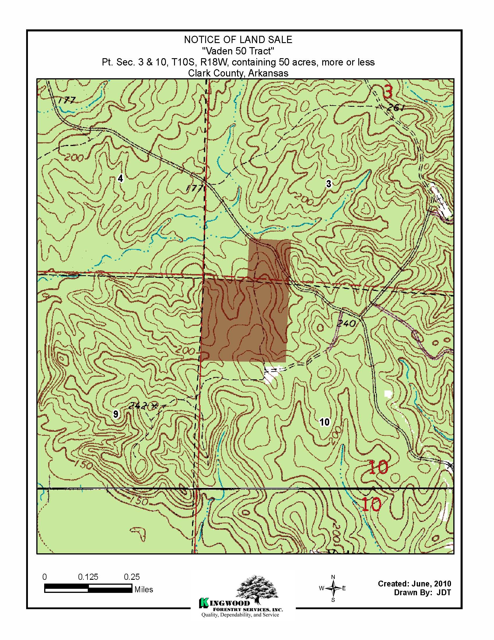 The Vaden 50 tract (listing #4172) will be sold by lump sum sealed bid on Friday, July 16, 2010, at 3:00pm. Located approximately seventeen miles south of Arkadelphia and six miles southwest of Sparkman. Access is frontage on gravel Vaden Road, plus additional access on gated Potlatch Road. Tract contains a 2007 pine plantation that was sprayed and burned prior to planting with 2nd generation Weyerhaeuser loblolly seedlings. Terrain is rolling. Soils consist of Sacul-Ruston Association and Sacul-Smithdale association with site index for loblolly pine averaging 80 feet on fifty year base. Gate lock on Potlatch Road can be opened with temporary 5-7-5-7 combination.