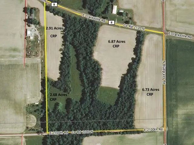 Located 3.2 miles west of Mill Creek Lake entrance off of Clarksville Rd; 30 minutes east of Charleston, IL; 1 hour 20 minutes southeast of Champaign, IL; 2 hours east of East St. Louis, IL; 3 hours south of Chicago, IL. +/- 36 acres total, +/- 19.41 acres tillable in 5 fields, +/- 16.59 acres wooded. 19.41 acres CRP paying $3,854.45 per year expiring in the Fall of 2022. CRP contracts can be cancelled to convert the fields back into crop production or pasture for livestock. Excellent deer, turkey, and small game hunting. Property has a variety of terrain changes. A small creek runs through the property. Property has road frontage on the north, east, and south sides of the property. Multiple home or cabin construction sites.