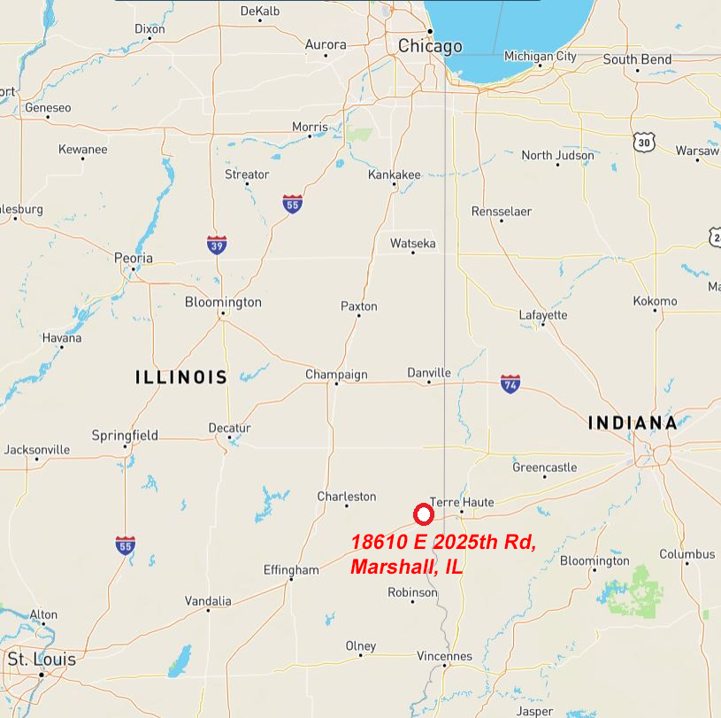 Research Parcel InformationSite Address: 18610 E 2025th Rd, Marshall, IL 62441 1.2 hrs southeast of Champaign IL. 3 hrs south of Chicago IL. 25 minutes west of Terre Haute IN. 1.5 hrs west of Indianapolis, IN.
