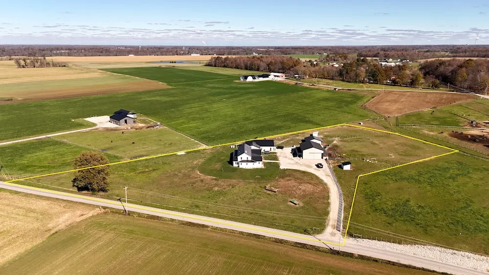 Discover one of the most picturesque settings in Southern Indiana with this 5.42-acre Amish-built homestead, ideally located less than 10 miles from the Charlestown Landing Rd/IN-62 interchange. This property perfectly blends traditional craftsmanship and modern convenience, featuring an expansive farmhouse, multiple outbuildings, and well-designed outdoor spaces for sustainable living. The 4,360 sq. ft. farmhouse offers spacious, open-concept living with a well-equipped kitchen, dining, and living area. Extensive hickory cabinetry, a corner pantry, and quality 2x6 stick-frame construction with spray foam insulation create an efficient and inviting space. The home is warmed by radiant floor heat and a wood-burning stove in the basement, while over 1,000 sq. ft. of covered porch space, complete with a charming porch swing nook, provides ample outdoor living options. The 2,800 sq. ft. poured-wall basement with 10-foot ceilings offers substantial room for future expansion. This homestead also boasts an impressive network of outbuildings to meet various needs, including a 2,400 sq. ft. pole barn with 1,600 sq. ft. of event space, an 800 sq. ft. apartment, and a spacious attic with exterior access. A 2,000 sq. ft. barn with four stalls, a tack room, 10-foot lean-tos on each side, and 12-foot Ag doors provide versatile storage and functionality. Additionally, a 900 sq. ft. insulated workshop is perfect for woodworking or an at-home business. Connected to a municipal water supply and an extensive sand-lined septic system, this property has access to rural electric, internet, and cable options along its nearly 550 feet of paved county road frontage. Approximately 3.5 fenced acres are divided into multiple paddocks, making this property ideal for small-scale farming or an active homestead. Experience this quintessential Southern Indiana property's charm, functionality, and sustainabilityperfect for those seeking a beautiful, self-sufficient lifestyle.