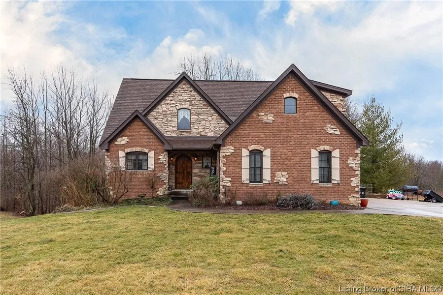 One-of-a-kind custom built home set on 6.05 ac of rolling fields and woods complete with a fishing pond and a vineyard. 4/5 bedrooms 3 full baths. The first floor boasts a master bedroom w/ window seat, w/in closet and private access to the bath with large soaking tub and a separate walk-in shower, ceramic tile flooring and wainscoting on the walls. 1st floor laundry and attached 2 car garage. The living features soaring ceilings and large stone hearth. The kitchen is adorable with specialized trim and charm along with granite counter tops and a custom-built hood. Go upstairs, past the built in carved bookshelves and the unique staircase made with trees from your back yard and you will reach a spacious 2nd floor. Here you will find yourself overlooking the living area and to the left you will find one bedroom with 10ft ceilings, w/in closet and views of your vineyard. Take the catwalk to the other side and you will find a nice bath, the third bedroom, a hall closet and a large bedroom/bonus room. Look carefully in 3rd bedroom, if you press on the right spot, you will discover a secret door leading to an awesome kids play and toy storage area. Last but not least the full w/out basement has French doors leading to a concrete patio. LVP throughout, another bedroom and full bath await. With over 1,000 sq. ft. of space 200 for storage. Fiber optic internet and 30 minutes to Louisville. One listing agent is seller. Sq ft & rm sz approx.