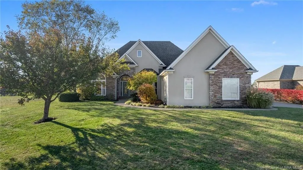 Welcome to 113 Bluff Ridge Road — where sophistication meets serenity in one of Jeffersonville’s most prestigious communities, Quarry Bluff Estates. Perfectly positioned atop the breathtaking quarry, this single-level luxury ranch offers timeless curb appeal, elegant comfort, and a truly remarkable setting. The spacious open floor plan features vaulted ceilings, a cozy gas fireplace, and abundant natural light that creates a warm, inviting atmosphere throughout. The kitchen provides generous counter space, stainless steel appliances, and both casual and formal dining options — perfect for hosting family and friends. The private primary suite is a retreat of its own, featuring a double vanity with a make-up station, walk-in shower, and a spacious closet. Step outside to enjoy one of the largest backyards in the neighborhood with a sprawling concrete patio and pergola — the perfect place to take in peaceful quarry views. With an oversized three-car garage, ample off-street parking, and an opportunity to finish attic space, this home offers both practicality and possibility. Experience refined living in a community unlike any other in Southern Indiana.
