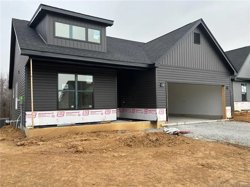 Schuler Homes' Independence Floor plan on a finished WALKOUT lower level! 4 bedrooms, 3 full baths with a wooded back-drop out back! Located in the desirable FAIRVIEW FARM subdivision conveniently located just north of Perry Crossing Rd in Sellersburg giving you easy access to Highway 31 and 60 and Covered Bridge Golf Community. You'll see why this is one of Schuler Homes top selling floor plans. The open floor plan is perfect for entertaining, featuring an in-wall fireplace with shelving on each side, an inviting eat-in kitchen with a corner pantry, tiled backsplash, granite countertops, and an island for more seating. Enjoy stainless steel appliances, pendant lighting, and abundant natural light from large windows. The deck off dining area is perfect for enjoying peaceful evenings outdoors. The master suite offers a serene retreat with dual sinks, a linen closet, and a beautifully tiled shower. The WALKOUT basement provides additional living space with a 4th bedroom, a 3rd bathroom, and a spacious family room, perfect for relaxation or hosting guests, and door to the back patio. Easy access to the mechanical room housing the Energy Efficient Water Heater and Heat Pump, plus the exterior walls are spray foam to help with the energy savings. SMART ENERGY RATED. The home will be ready for you to move into by the end of March/first of April, just in time to start enjoying the great backyard! LOT 208. All measurements and sq. ft. are approximate. If critical, Buyer to verify.