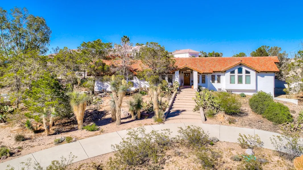A remarkable Spanish Ranch-style home on 2.04 acres! The home boasts hardwood floors, custom trim work, vaulted ceilings, and large windows overlooking the spectacular Eldorado Valley. The home has a very open floor plan and large kitchen. This home is a wildlife sanctuary with the potential for a pool/spa, casita, and horse property. Land surrounding the home is raw land. Completely enclosed with block and wrought iron walls. The home has three levels with the main living and master bedroom on the main floor.