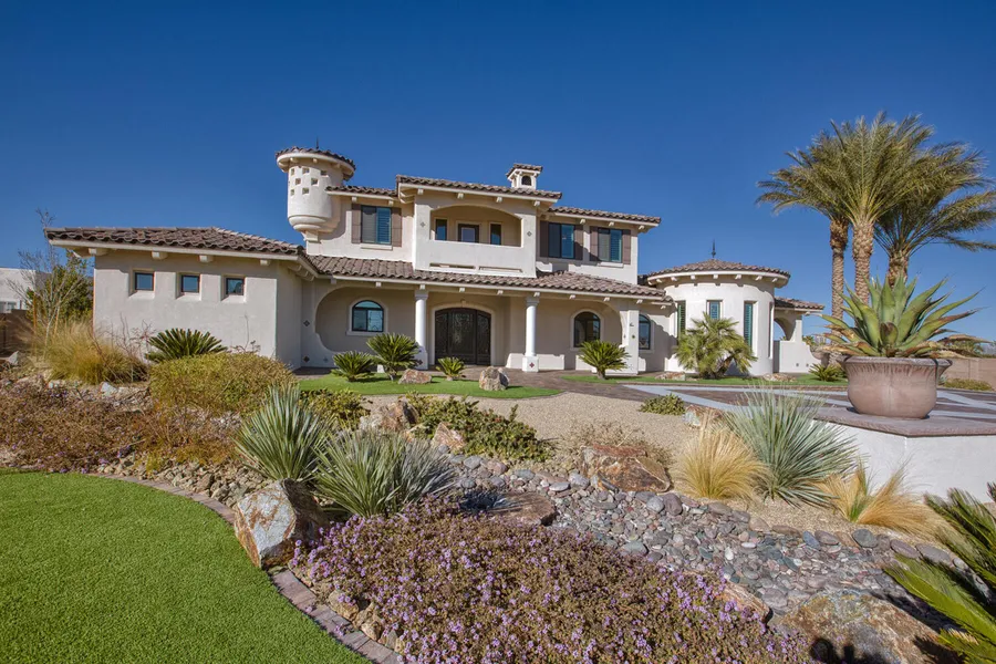 An enchanted oasis complex just minutes to the fabulous Las Vegas strip! This one-acre gated retreat features southwest inspired design and modern construction. This home features a rotund great room, a chefs grade kitchen with seating for lots of guests, and a round formal dining area, and office. For rest and relaxation, there are three bedrooms, a loft for entertainment and play. Also featured are a 7-car garage with an office, a spiral staircase that leads up to a 30-foot observation tower. The inner courtyard has a barbeque area, a fireplace and is perfect for hosting year-round outdoor events. This gated estate home has lots of room for expansion. If you are looking for a luxury home without the rules of living in a homeowner association, this might be the dream home for you!